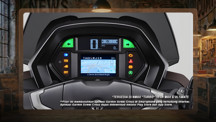 Untuk urusan teknologi di dasbor, Yamaha NMAX varian tertinggi (Tech Max) melompat cukup jauh dengan layar TFT berwarna yang bisa menampilkan navigasi Garmin secara penuh.