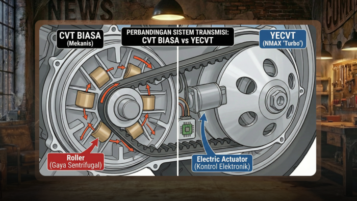 Berbeda dengan transmisi matic konvensional yang mengandalkan gaya sentrifugal dari “roller” (pemberat) untuk mengubah rasio sabuk, YECVT menggunakan motor listrik (actuator) yang dikendalikan oleh komputer (ECU). Hasilnya adalah fitur Y-Shift, yang memungkinkan pengendara mendapatkan dorongan instan atau efek engine brake hanya dengan menekan tombol. Jadi, inovasi ini terletak pada transmisi pintarnya, bukan pada sistem induksi udara mesinnya.