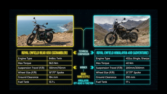 - Himalayan 450 (196 kg): Lebih ringan 20kg dari Bear. Tangki besar (17L) didesain ramping di bagian paha, memudahkan rider berdiri (standing position) saat melibas jalur rusak.