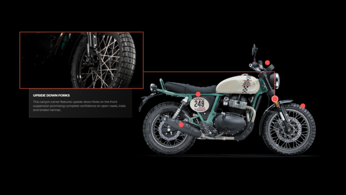 Roda & Pengereman: Mengadopsi konfigurasi mullet khas tracker/scrambler: 19 inci di depan dan 17 inci di belakang. Velg jari-jari ini dibalut ban khusus MRF Nylorex yang dikembangkan spesifik untuk motor ini dengan pola kotak-kotak agresif. Pengereman dipercayakan pada cakram 320mm di depan dan 270mm di belakang, lengkap dengan Switchable ABS (ABS belakang bisa dimatikan untuk brake slide).