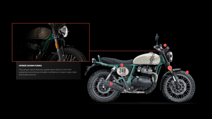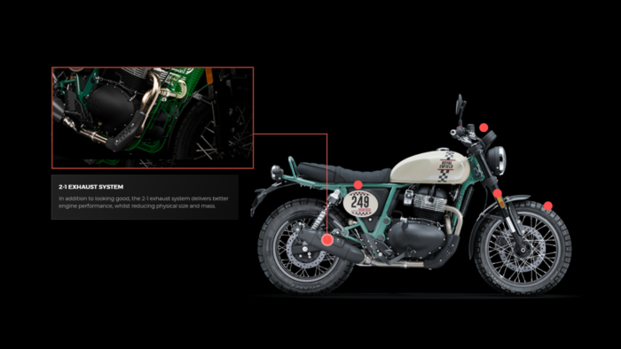 Secara visual, ia meninggalkan kesan sopan Interceptor dan beralih ke postur yang agresif. Papan nomor di samping (side panel), jok bergaya bench seat dengan tekukan di belakang, serta sasis yang sedikit diubah pada bagian sub-frame belakang yang menukik ke atas, semuanya meneriakkan aura scrambler 60-an yang kental.